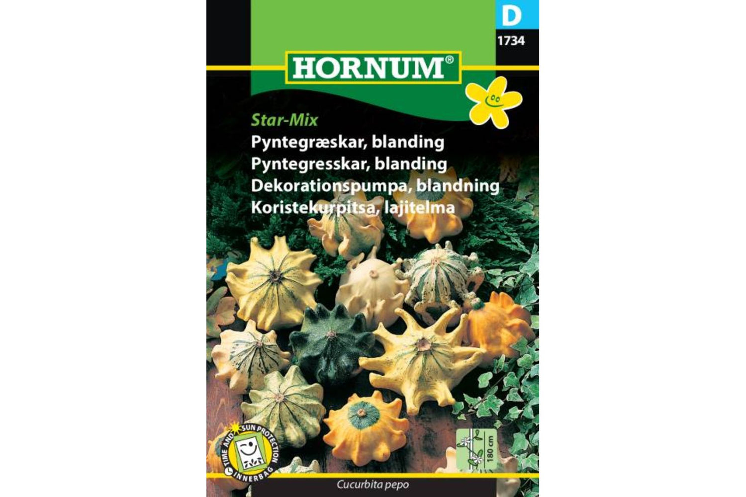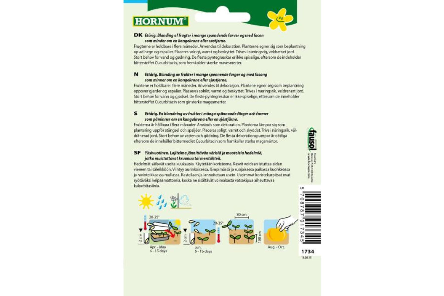Ettårig. Blanding av frukter i mange spennende farger og med fasong som minner om en kongekrone eller sjøstjerne.