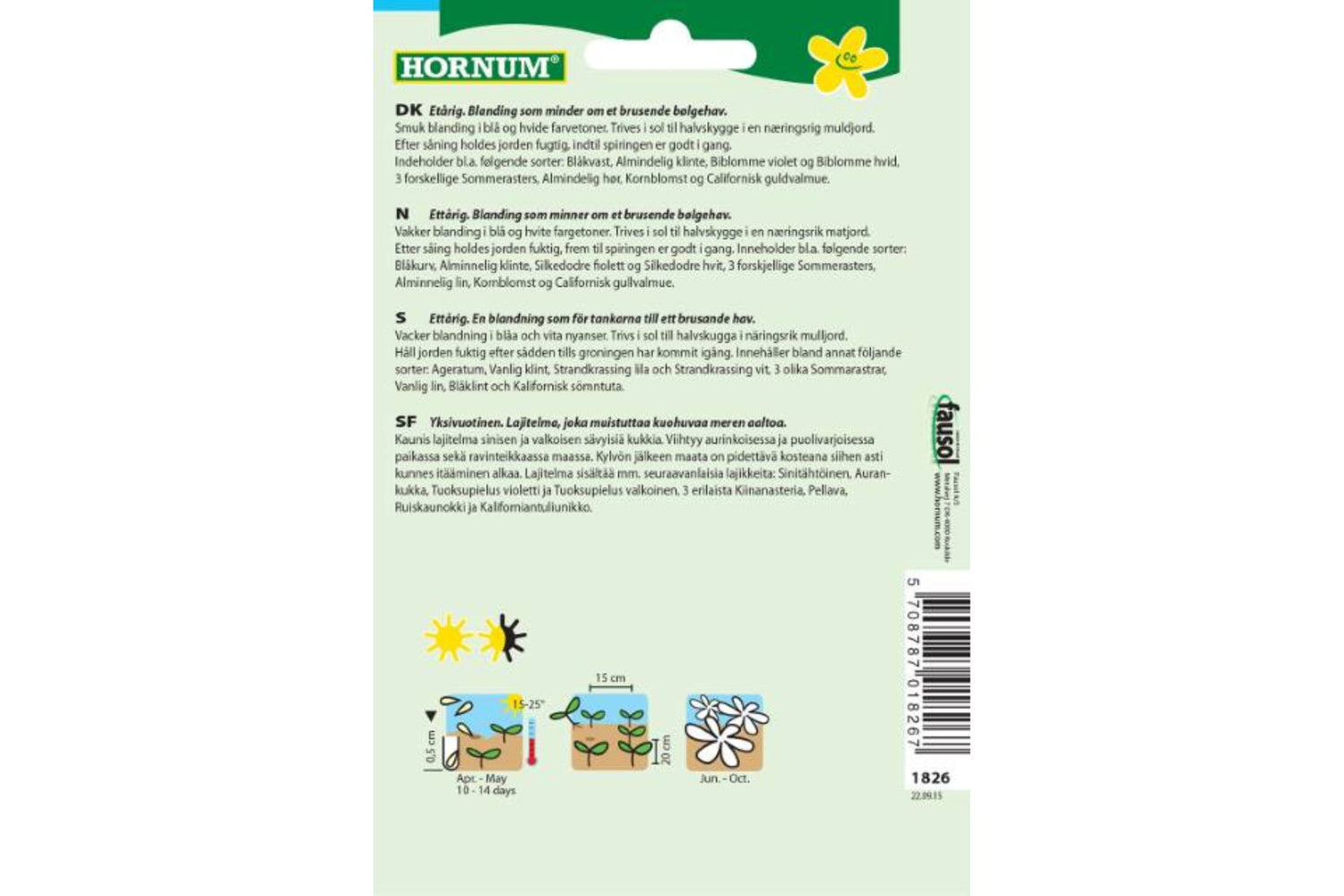 Blandingen inneholder bl.a. Blåkurv, Alminnelig klinte, fiolett og hvit Silkedodre, 3 forskjellige Sommerasters, Alminnelig lin, Kornblomst og Californisk gullvalmue. Perfekt for blomsterbed, villhager eller blomsterenger.