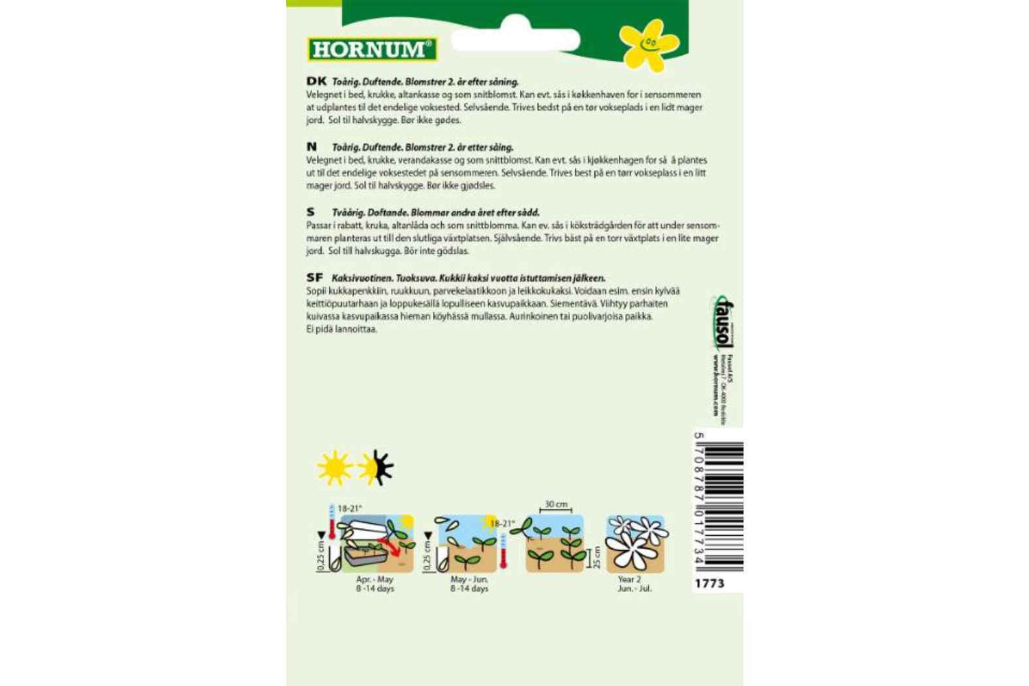 Toårig. Duftende. Blomstrer 2. år etter såing.