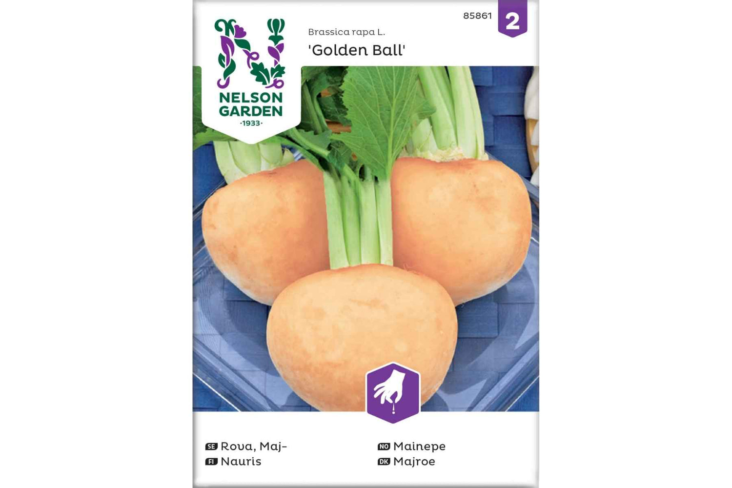 Golden Ball er en vakker, hurtigvoksende mainepe med gyldne kuler som minner om reddiker. Denne kålplanten danner oppsvulmede røtter som kan høstes vår, sommer og høst, og gir en delikat og søt smak. For å beskytte mot skadedyr som sommerfugl, møll og fluer, anbefales det å dekke plantene med nett.
