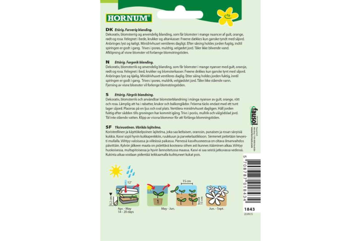 Dekorativ, blomsterrik og anvendelig blanding, som får blomster i mange nyanser med gult, oransje, rødt og rosa. Velegnet i bed, krukker og blomsterkasser. Frøene dekkes kun ganske tynt med såjord. Anbringes lyst og kjølig. Minidrivhuset ventileres daglig. Etter såing holdes jorden fuktig, frem til spiringen er godt i gang. Trives i porøs, muldrik, velgjødslet jord. Tåler ikke stående vann. Fjerning av visne blomster vil forlenge blomstringstiden.