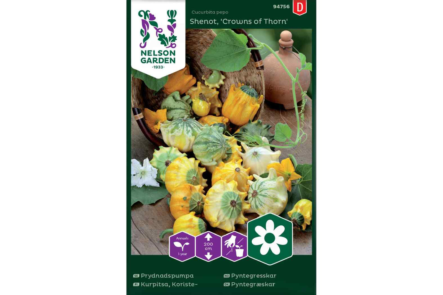 'Crowns of Thorns' er en fascinerende pyntegresskarsort som gir gresskar med unike kronelignende former. Fruktene varierer i farger fra stripete nyanser av oransje, rødt, grønt og hvitt, noe som gjør dem perfekte som dekorasjon i høstsesongen. Planten produserer vakre gule blomster før fruktene utvikler seg.