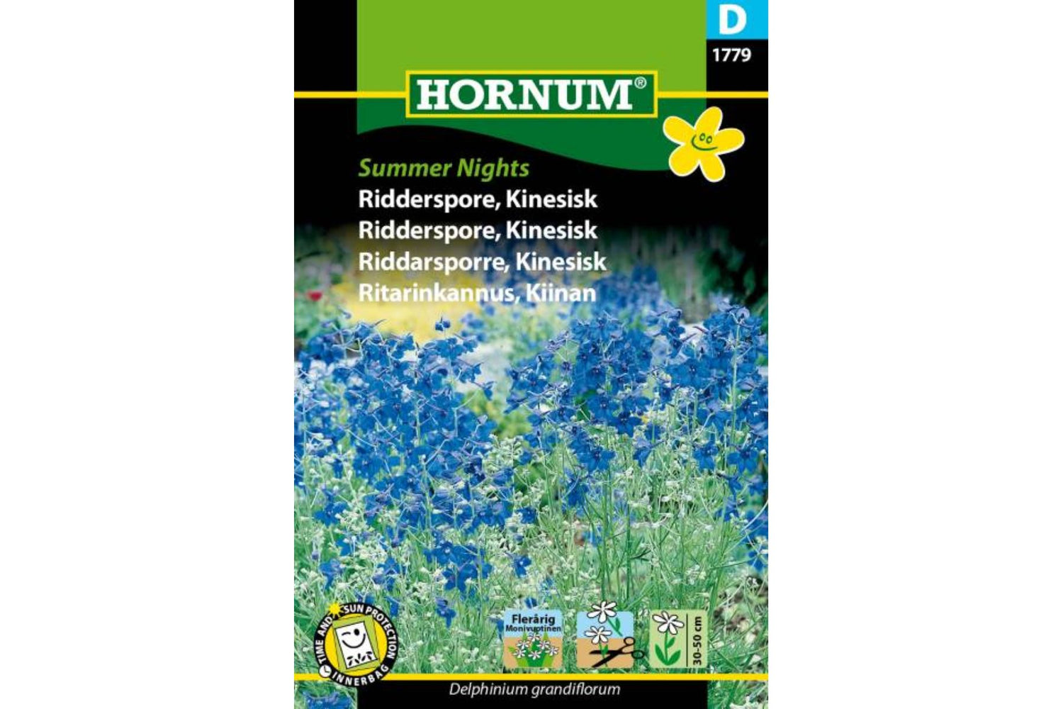Ridderspore Summer Nights er en flerårig, kompakt og lav plante som pryder hagen med sine dyp blå blomster og vakre, flikete blader. Den er svært blomstringsvillig og tilfører både eleganse og farger til staudebedet. I tillegg er den en utmerket snittblomst som gir langvarig glede i dekorative buketter. Denne planten trives godt i solrike omgivelser og foretrekker humusrik, porøs jord. Det er viktig å beskytte den om vinteren for å sikre overlevelse, og den må plantes på steder uten stående vann for å trives best.