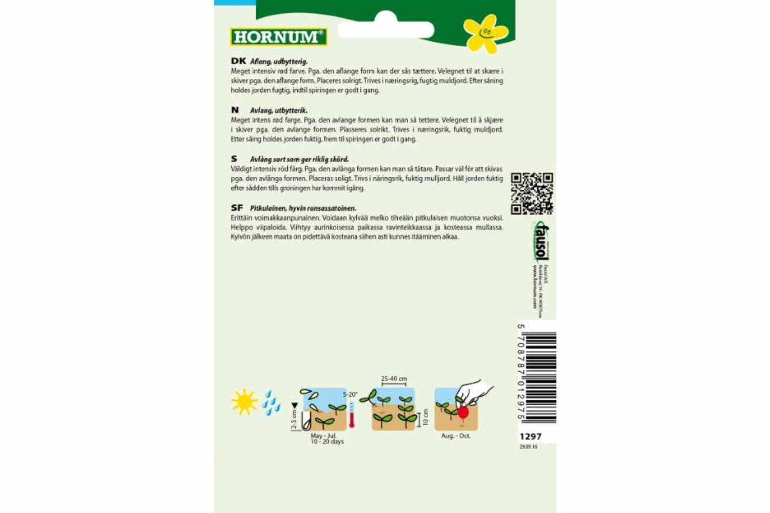 Meget intens rød farge. Pga. den avlange formen kan man så tettere. Velegnet til å skjære i skiver pga. den avlange formen. Plasseres solrikt. Trives i næringsrik, fuktig muldjord. Etter såing holdes jorden fuktig, frem til spiringen er godt i gang.