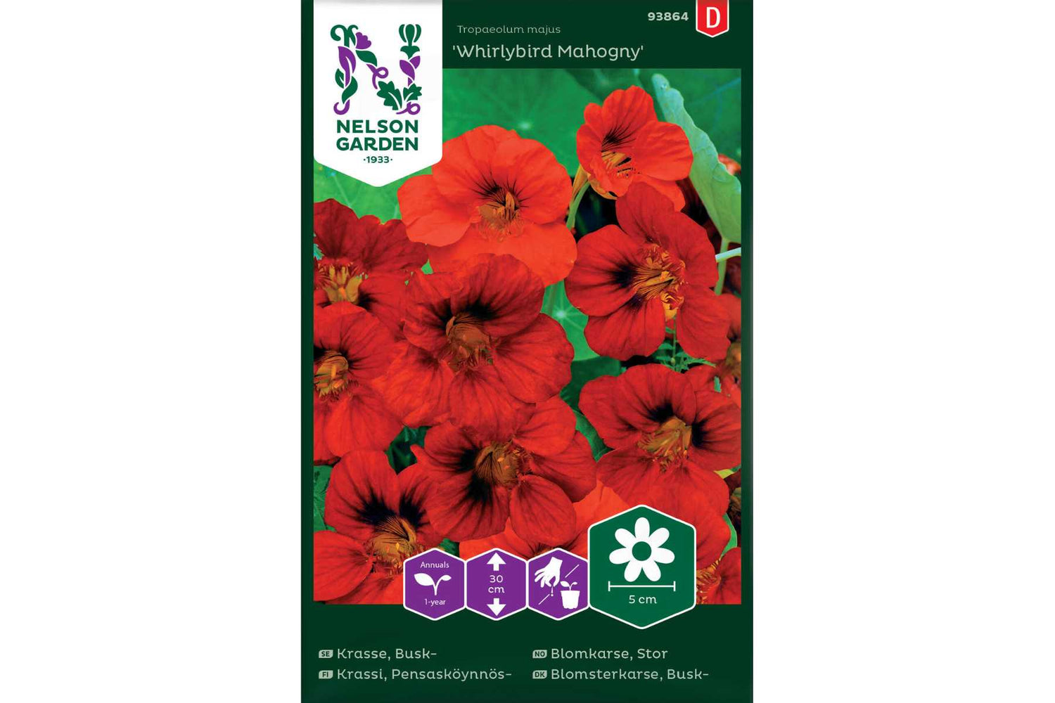 Blomkarsen/Indiankarsen ’Whirlybird Mahogny’ byr på et vakkert skuespill med sine halvfylte, rødbrune blomster på lave, buskete planter. De er fine både i en potte på uteplassen og som dekorasjon i f.eks. en salat – blomstene kan spises! En god retningslinje er å starte forkultiveringen omtrent 8 uker før det er tid for utplanting. Så ett til to frø i hver potte i fuktig såjord. Plasser i romtemperatur, etter spiring lyst og svalt. Du kan også direkteså tidlig på sommeren. Vann såjorden før du sår og hold sådden fuktig til frøene har spirt.