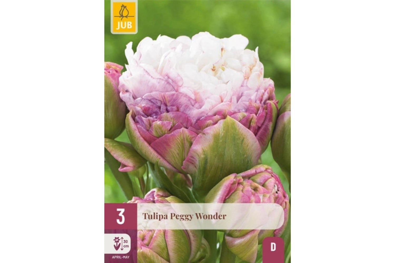Tulipan ‘Peggy Wonder’ er en blendende vakker, dobbelblomstrende tulipan som kombinerer ren hvit eleganse med romantiske toner av rosenlilla. De tettpakkede kronbladene danner en frodig og nesten pionlignende blomst som virkelig gjør inntrykk – enten i potter, bed eller som dekorativ snittblomst.