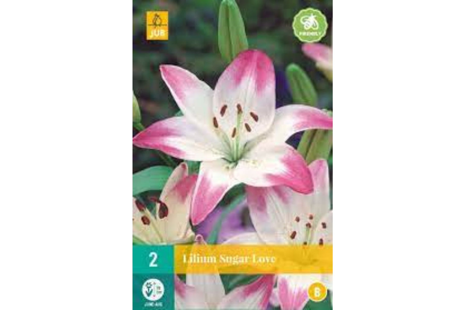 Lilje ‘Sugar Love’ er en elegant og romantisk lilje med en delikat tofarget kombinasjon av myk rosa og hvitt. Denne vakre liljen tilfører et sjarmerende preg i blomsterbed, potter og som snittblomst. Med sin kompakte vekst og lange blomstringstid skaper den en drømmende atmosfære i hagen. Den trives i sol, men tåler også halvskygge, noe som gjør den til et fleksibelt og lettdyrket valg.