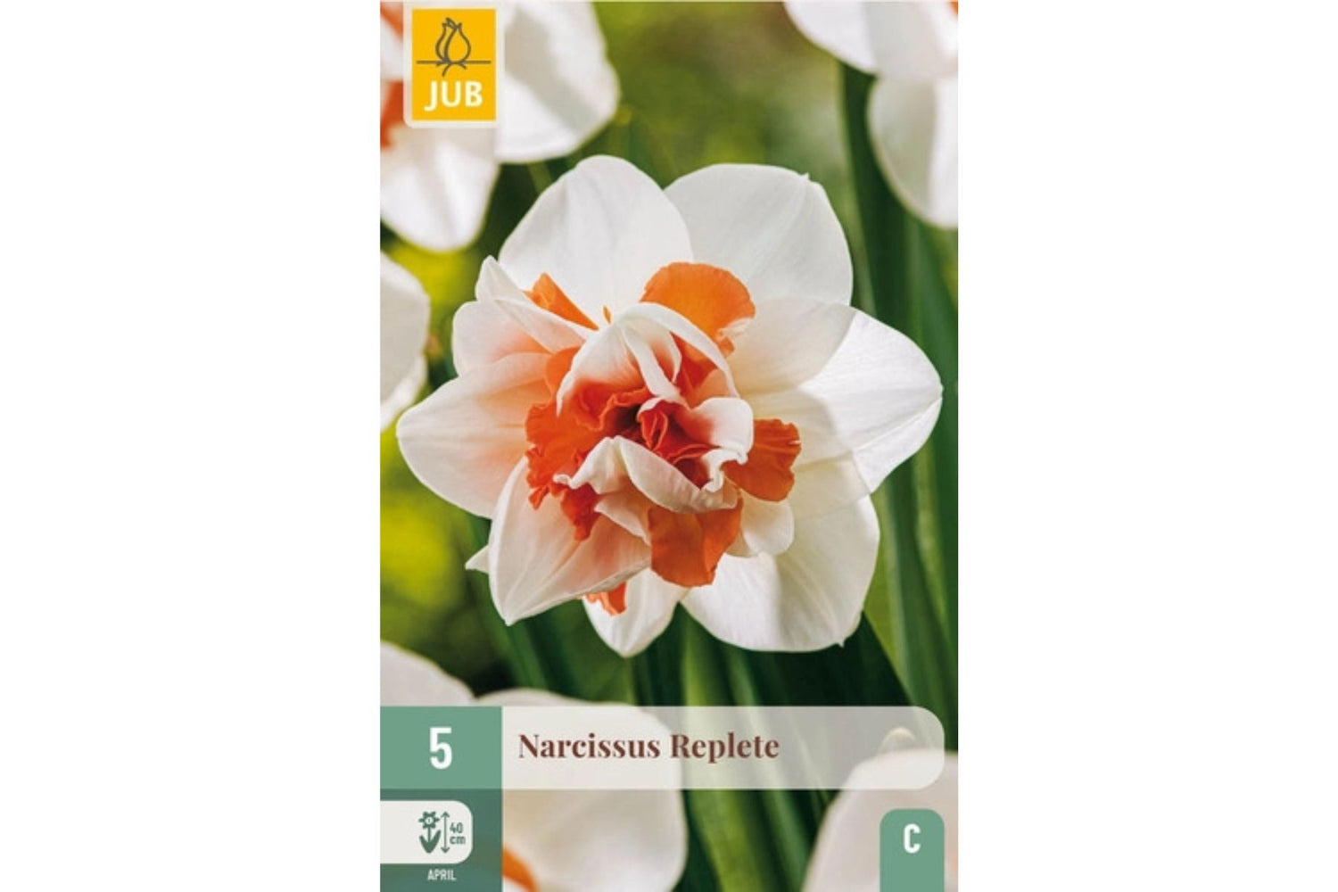 ‘Replete’ er en sjeldent vakker, dobbeltblomstrende påskelilje som kombinerer romantiske fargetoner med en nydelig duft. De store, fyldige blomstene har hvite ytre kronblader og et rikt, aprikosrosa senter med frynsede detaljer – et unikt innslag i vårhagen som garantert tiltrekker seg blikk. Som medlem av gruppe 4 (doble påskeliljer), byr ‘Replete’ på pionlignende blomster som blomstrer litt senere på våren. En flerårig skjønnhet som trives i både sol og halvskygge.