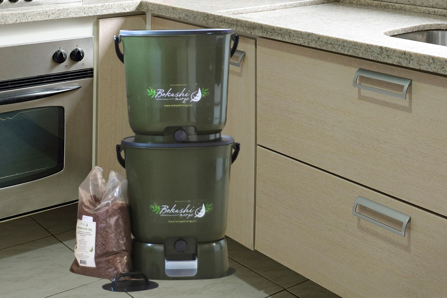 Bokashi Eko Startpakke – Oliven | Komplett sett for kjøkkenkompostering