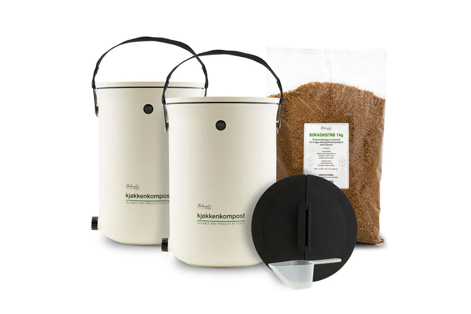 • Inkludert: 2 bokashibøtter med dobbel konstruksjon, innerlokk med silikonkant, tappekopp og 1 kg bokashistrø