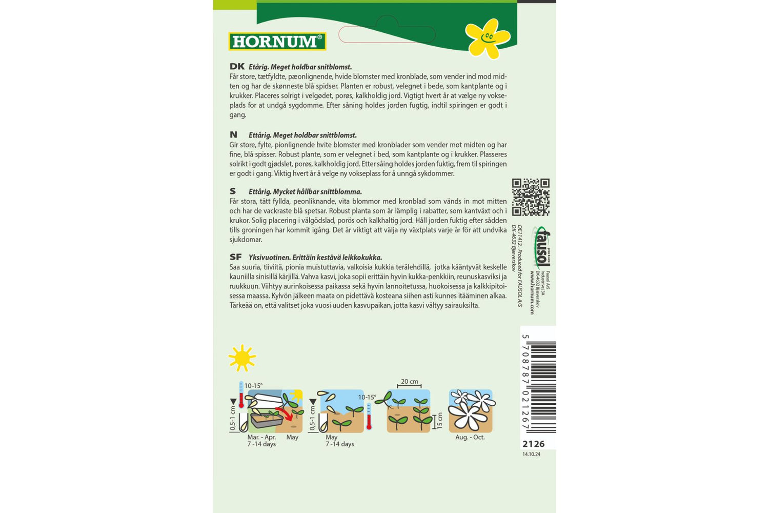 Asters Peon ‘Blue Ice’ er en ettårig sort med store, fylte blomster som ligner pioner. De hvite kronbladene har delikate blå spisser, noe som gir et elegant og unikt uttrykk i hagen. Planten er robust og egner seg godt i blomsterbed, som kantplante og i krukker. Den er også en meget holdbar snittblomst, perfekt for buketter.