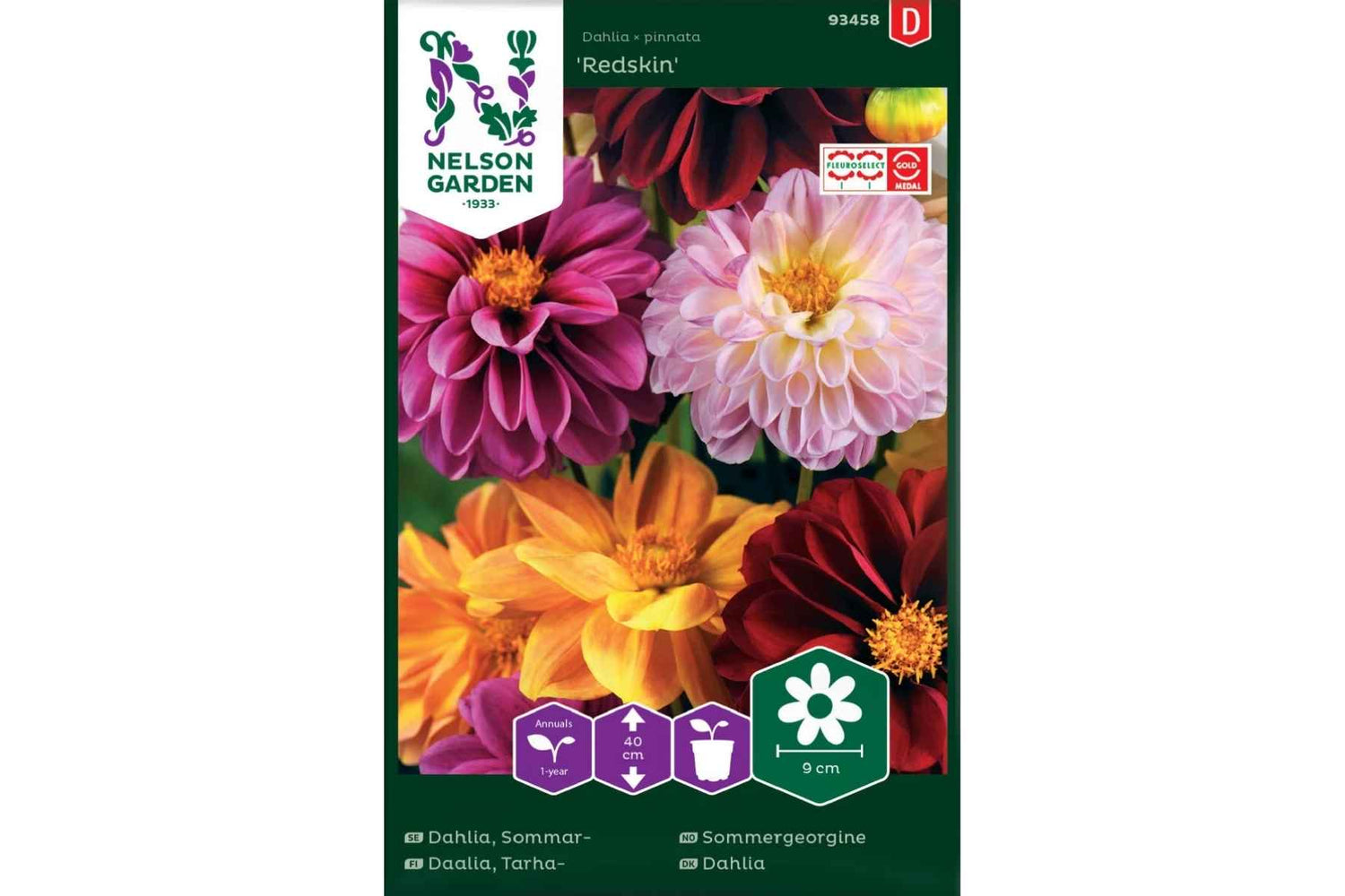 Redskin er en sommergeorgine med store, doble blomster i sterke farger, som står i vakker kontrast til det mørkt rødglinsende bladverket. Planten er tidligblomstrende og ganske værtålig, noe som gjør den ideell for sommerhagen. For å oppnå en fyldigere vekst, topp plantene og fjern de første blomsterknoppene. Sommergeorgine trives best i moldrik og porøs jord.
