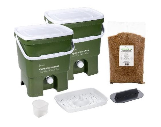 Alt du trenger for å komme i gang med enkel og miljøvennlig kompostering hjemme! Bokashi Klassisk Startpakke inneholder to romslige bokashibøtter på ca. 15 liter, laget av resirkulert plast, perfekt for deg som ønsker å kompostere matavfall effektivt og uten lukt.