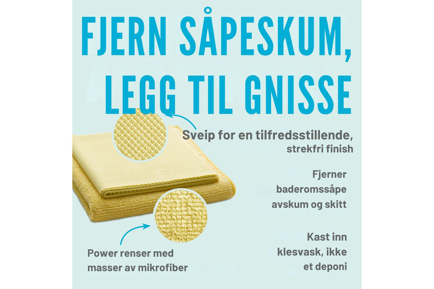 Bruksanvisning: Bruk baderomskluten tørr for støvtørking, eller fuktet med varmt vann for å fjerne smuss og fett. Etter vask, bruk glass- og poleringskluten for å få en stripefri, skinnende overflate. Brett klutene to ganger for å maksimere rengjøringsflaten, og bruk én side av kluten på første flate før du snur til den andre siden.