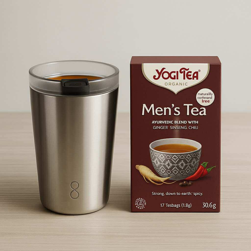 Te og tumbler – ekte kvalitet til ham kombinerer den kraftfulle Yogi Tea Men’s Tea med den prisvinnende Ocean Bottle Tumbler 350 ml i rustfritt stål – et symbol på ansvar og stil i hverdagen.