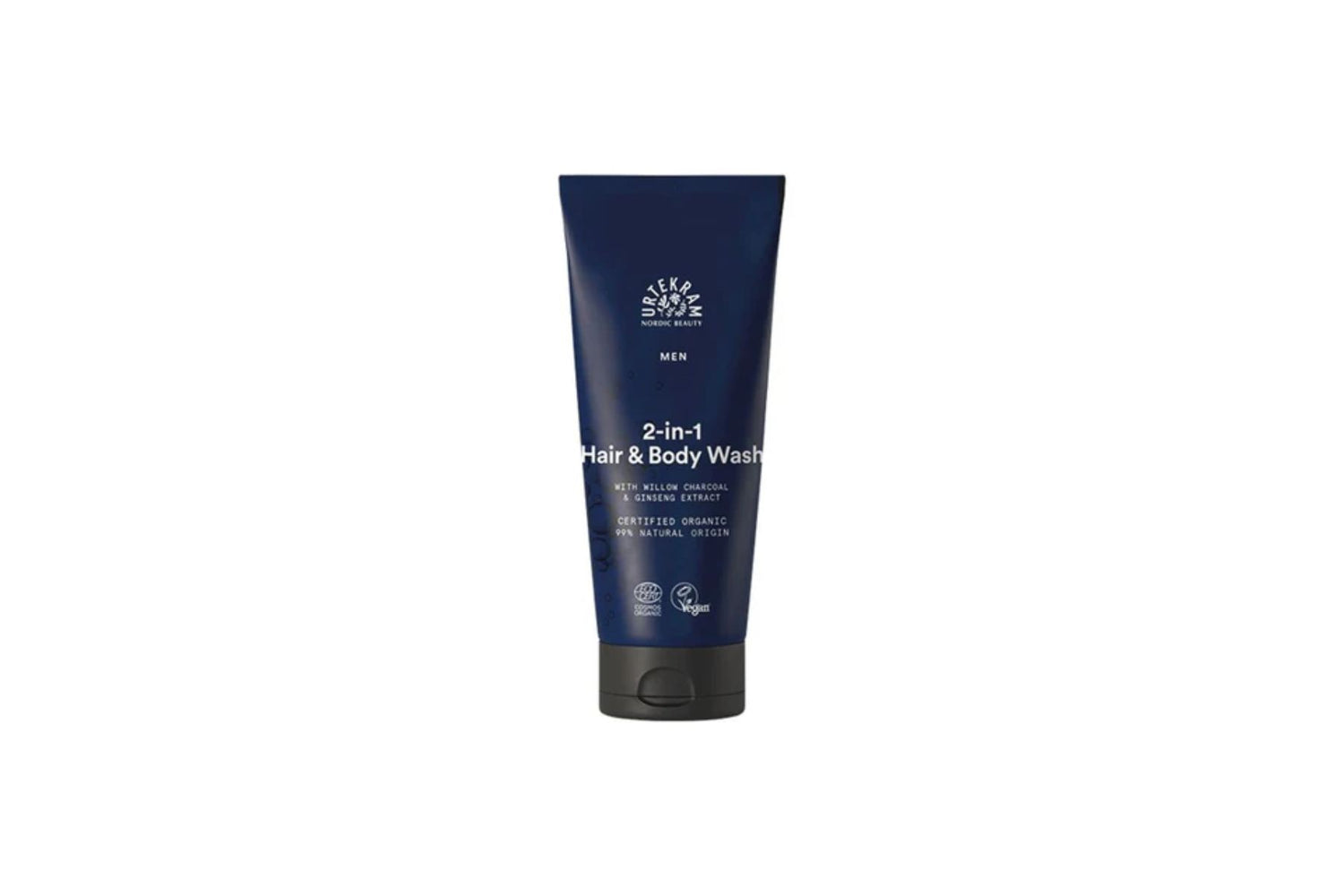 Urtekram Men 2-in-1 Hair & Body Wash er en økologisk sertifisert og vegansk såpe spesielt utviklet for menn. Produktet kombinerer hårvask og kroppsvask i én praktisk løsning, og er formulert med ginsengekstrakt og økologisk piletrekull som effektivt renser både hud og hår uten å tørke ut.
