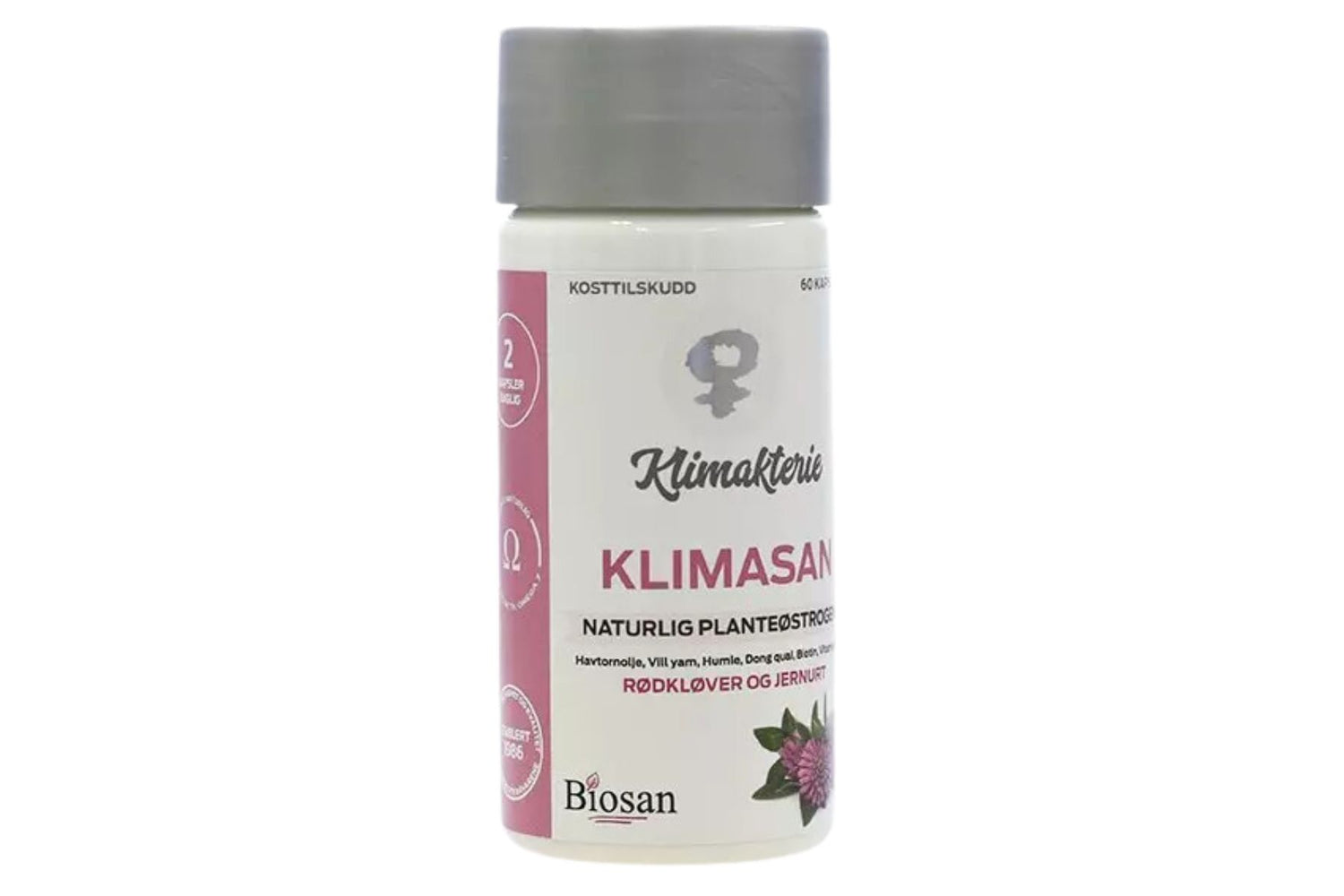 Biosan Klimasan er et 100 % naturlig kosttilskudd utviklet for kvinner som opplever ubehagelige klimakterieplager som hetetokter, nattesvette og humørsvingninger. Med en unik blanding av rødkløver, kjent for sitt innhold av planteøstrogener (fytoøstrogener), kan Klimasan bidra til å balansere østrogennivåene i kroppen og redusere symptomer knyttet til overgangsalder og PMS. Havtornolje, som er rik på Omega-7, samt biotin støtter normale slimhinner, hud og hår for et helhetlig velvære.