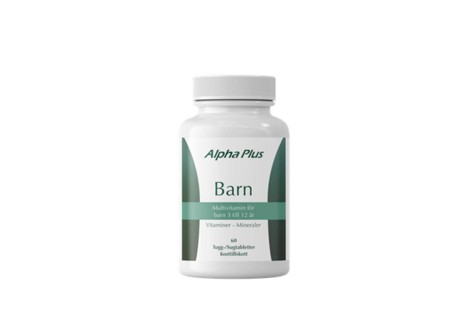 Alpha Plus Barn er et komplett multivitamin med 12 vitaminer og 7 mineraler spesielt utviklet for barn i alderen 3 til 12 år. Multivitaminet inneholder blant annet D-vitamin, som er nødvendig for normal vekst og utvikling av barns benbygning, og C-vitamin, som bidrar til immunsystemets normale funksjon. Tablettene kan tygges eller suges, noe som gjør dem enkle for barn å innta.