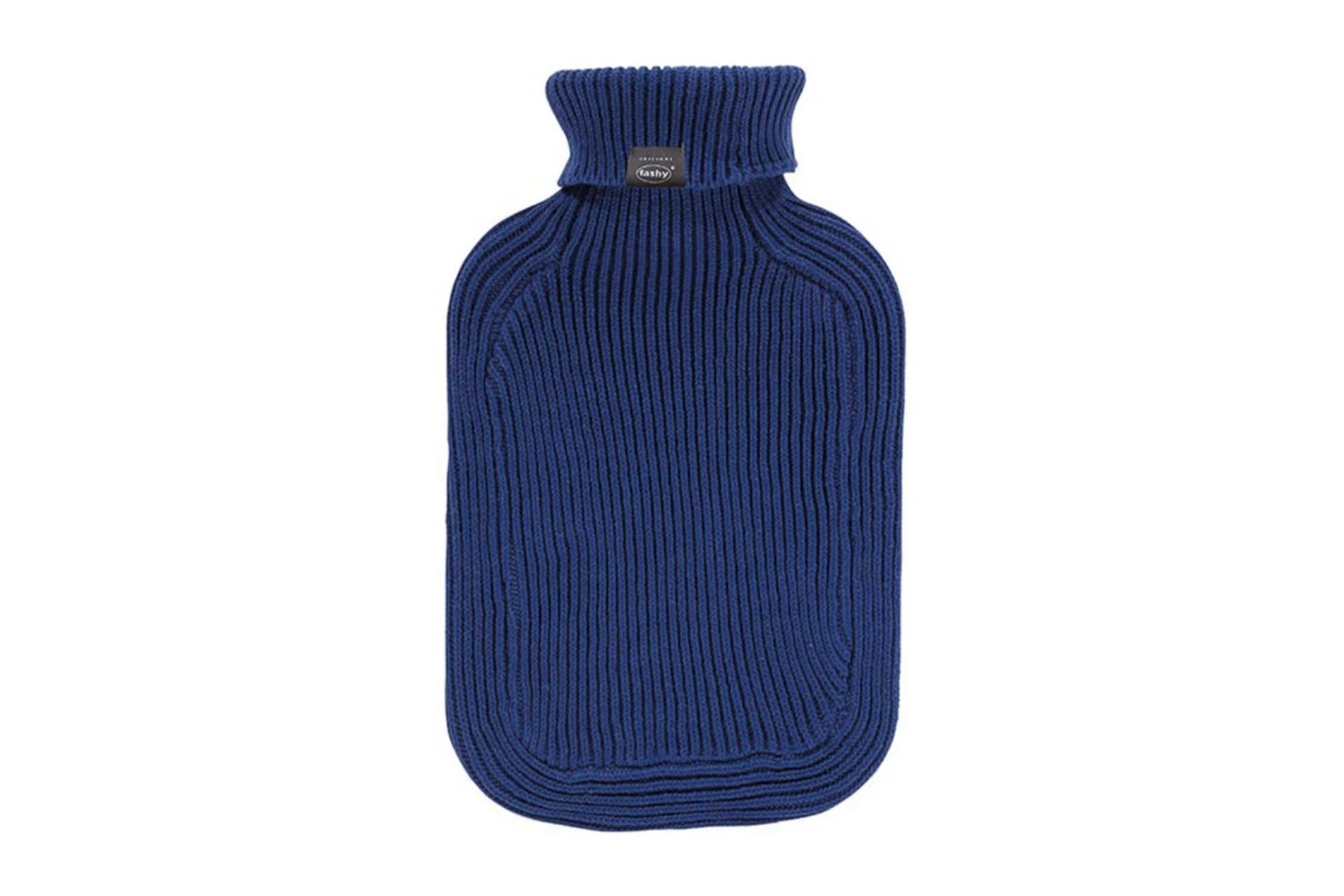Fashy varmeflaske i marineblått bomullstrekk gir behagelig varme og lindring på kalde dager. Den kan brukes til å varme opp sengen, barnevognen eller som varmebehandling for stive og ømme muskler.