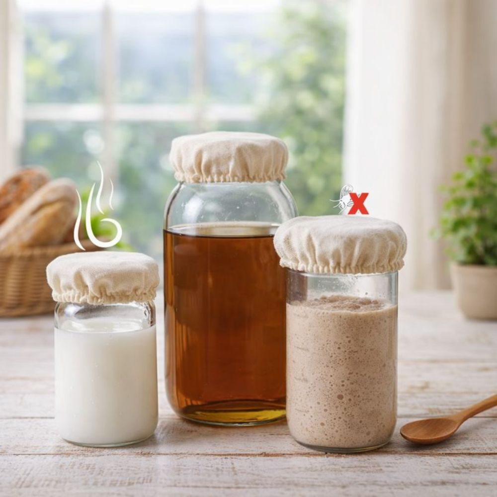 Dette settet med to gjenbrukbare stofftrekk er utviklet for naturlig fermentering av surdeigsstarter, kombucha, kefir og ost. Stofftrekkene legges over glass og festes enkelt, slik at innholdet får puste samtidig som det beskyttes mot støv og insekter.