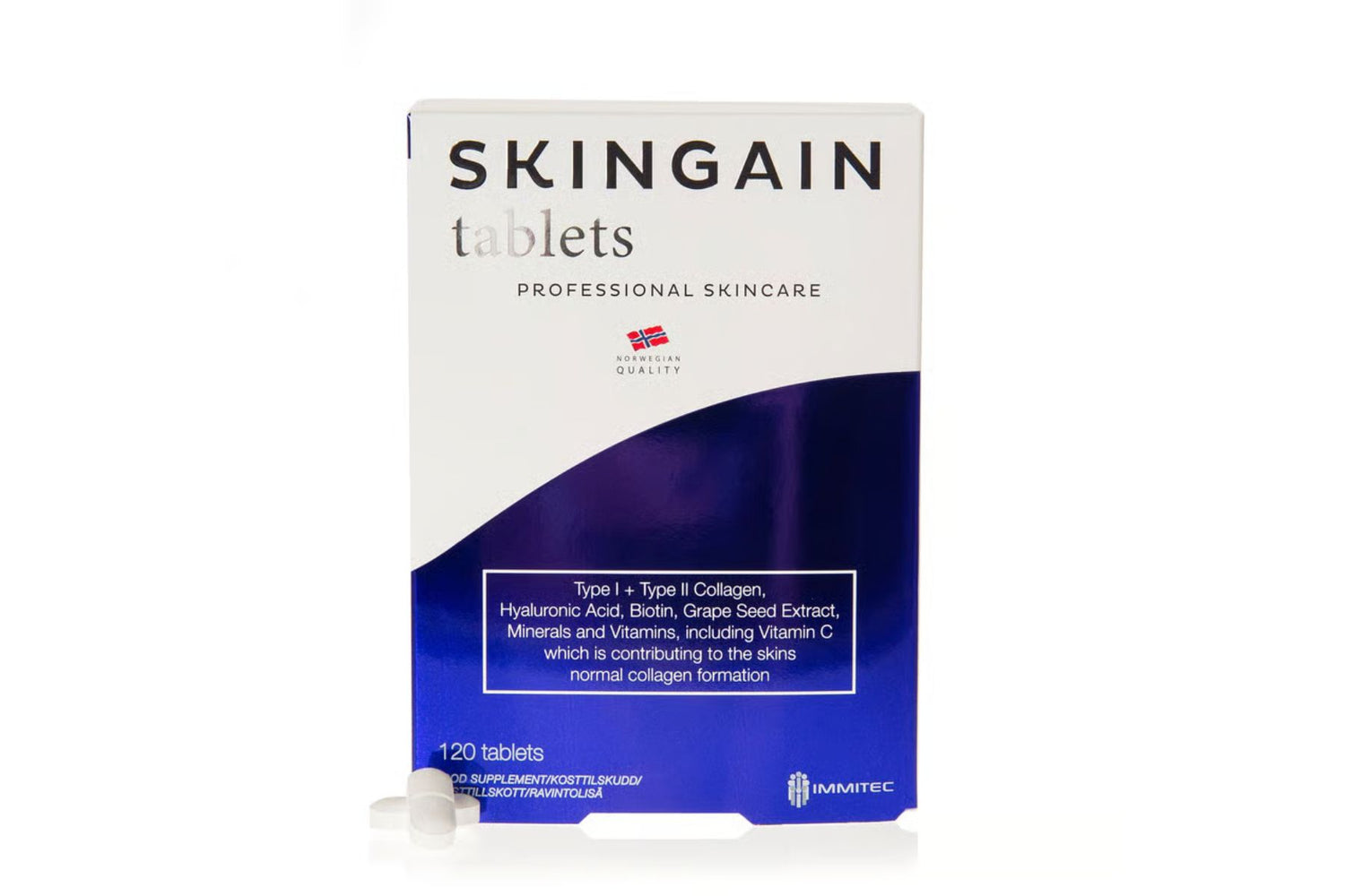 Skingain Professional er et avansert kosttilskudd designet for å støtte hudens styrke, struktur og elastisitet. Inneholder en dokumentert blanding av type 1 og type 2 hydrolisert kollagen, kombinert med nøye utvalgte vitaminer og mineraler som vitamin C, A, B2, biotin, sink og kobber. Disse ingrediensene jobber sammen for å opprettholde en sunn hud som ser yngre og mer strålende ut.