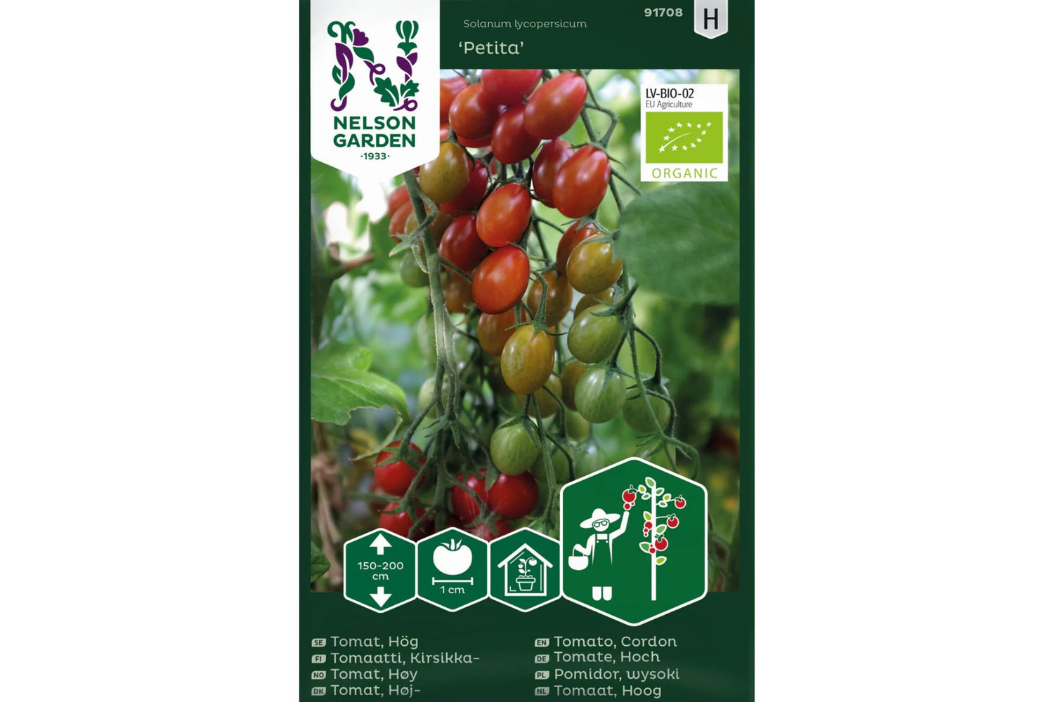 'Petita' er en spennende nyhet blant tomatsorter, med små, dråpeformede frukter som minner om store gojibær. Tomatene modnes tidlig og sitter tett i elegante klaser. Smaken er søt og saftig, med en delikat tekstur som gjør dem perfekte som snacks eller i salater. Planten har en sparsom og luftig vekstmåte med små blader, noe som gjør den plassbesparende og enkel å dyrke.