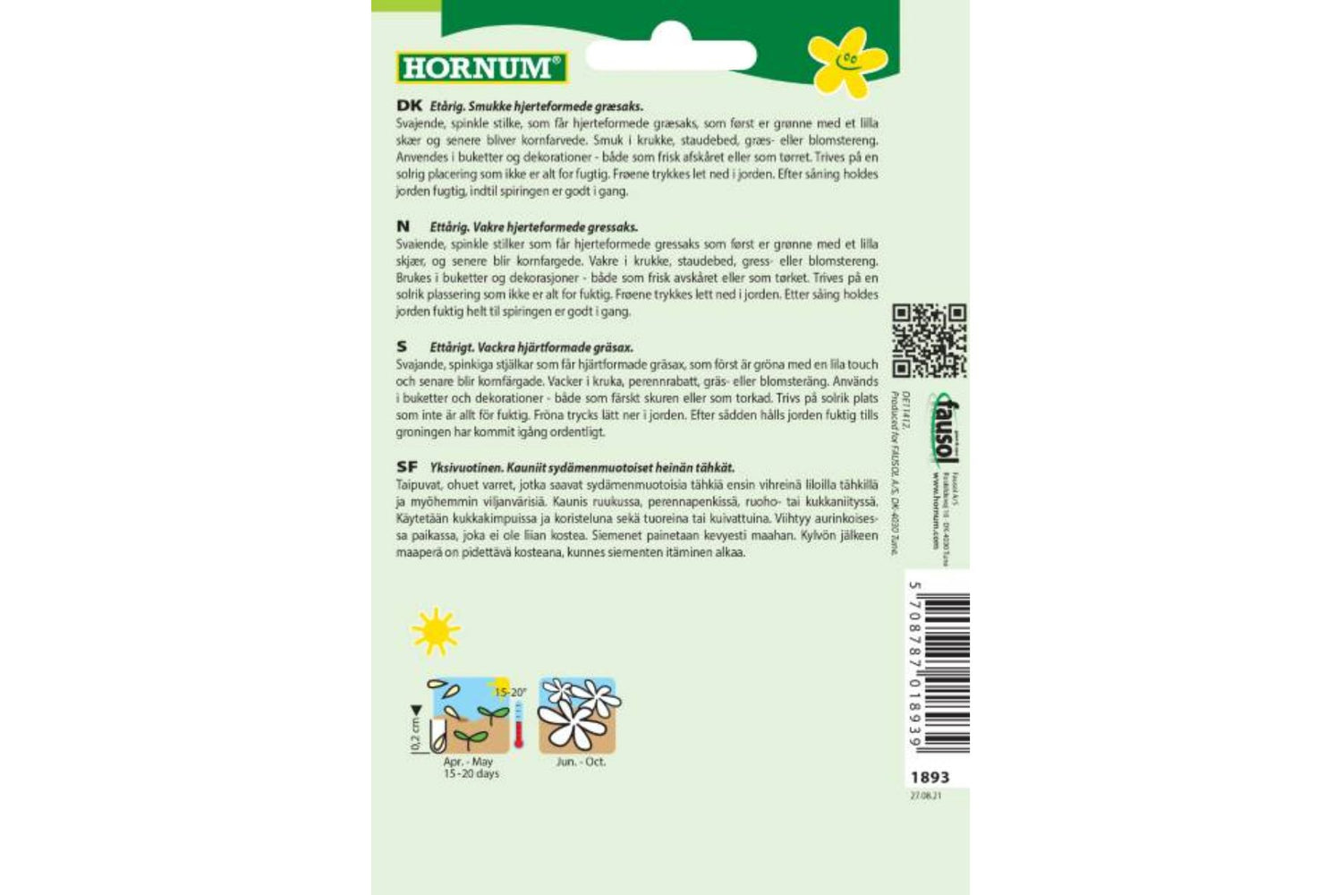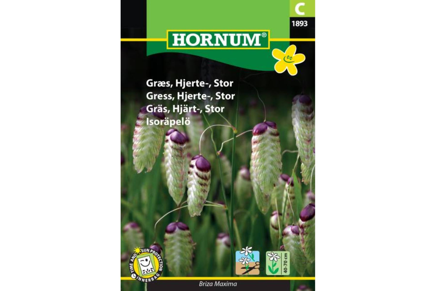 Ettårig. Hjerte Stor er et elegant prydgress med vakre, hjerteformede gressaks som gir et unikt og iøynefallende innslag i hagen. De spinkle stilkene bærer aks som først er grønne med et lilla skjær, og som senere modnes til en kornfarge. Dette gresset passer perfekt i krukker, staudebed, gressenger eller blomsterenger.