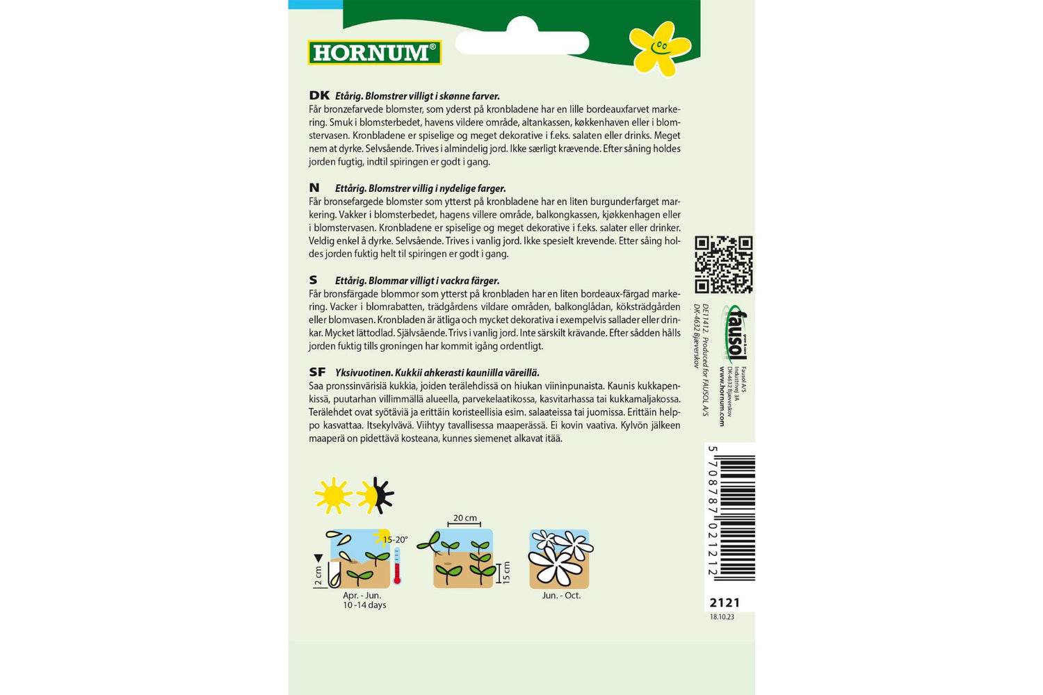 Morgenfrue Hage er en blomstringsvillig plante som pryder hagen med nydelige bronsefargede blomster. Ytterst på kronbladene finner du en elegant burgunderfarget markering, som gir blomsten et sofistikert uttrykk. Denne vakre planten passer perfekt i blomsterbed, hagens villere områder, balkongkasser, kjøkkenhager eller som snittblomst i en vase.