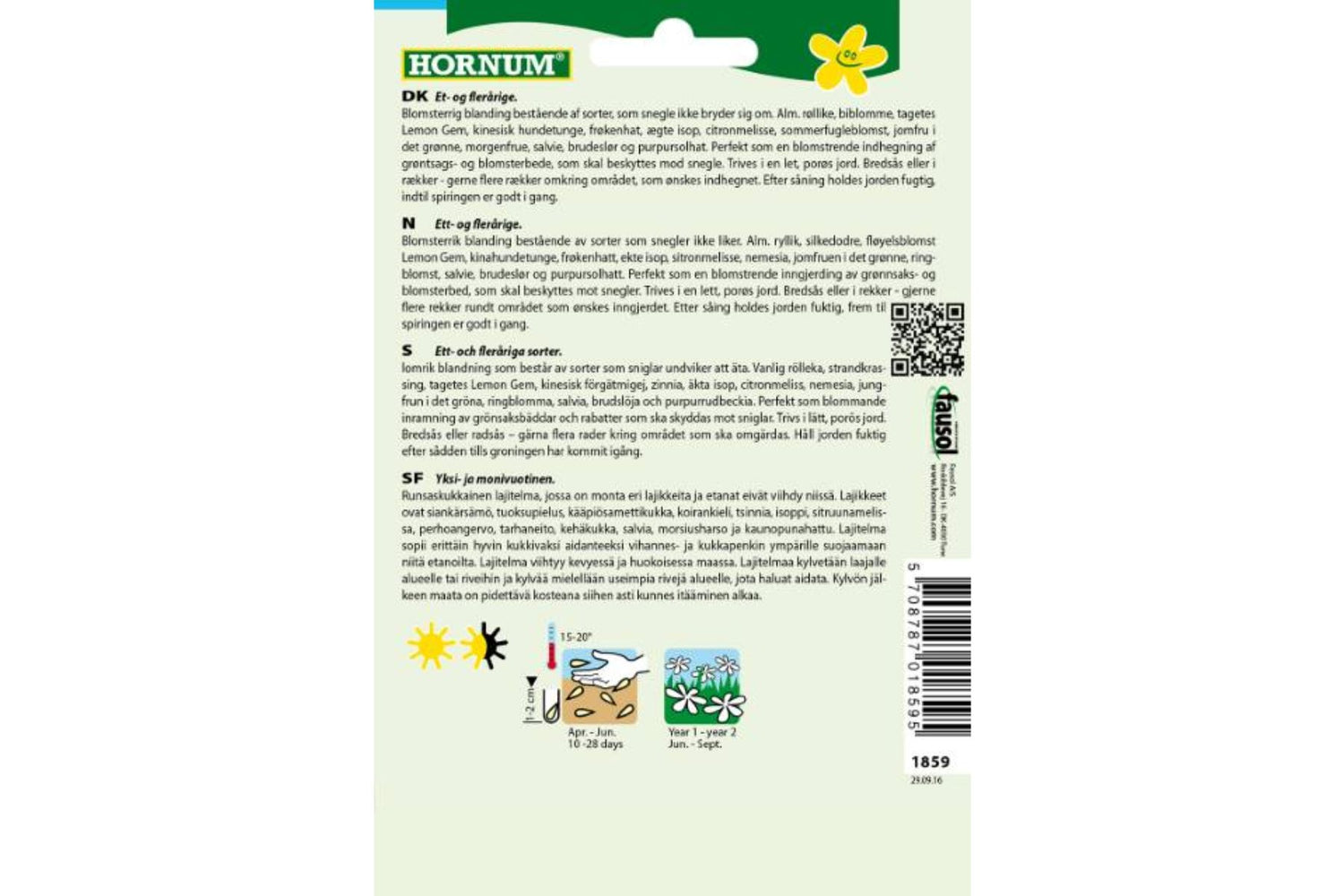 Ett- og flerårig. Sneglefri er en blomsterrik blanding av sorter som snegler unngår, noe som gjør den ideell for å beskytte grønnsaks- og blomsterbed. Perfekt for å skape en blomstrende inngjerding rundt områder i hagen som skal beskyttes mot snegler, samtidig som du kan nyte vakre blomster hele sesongen.